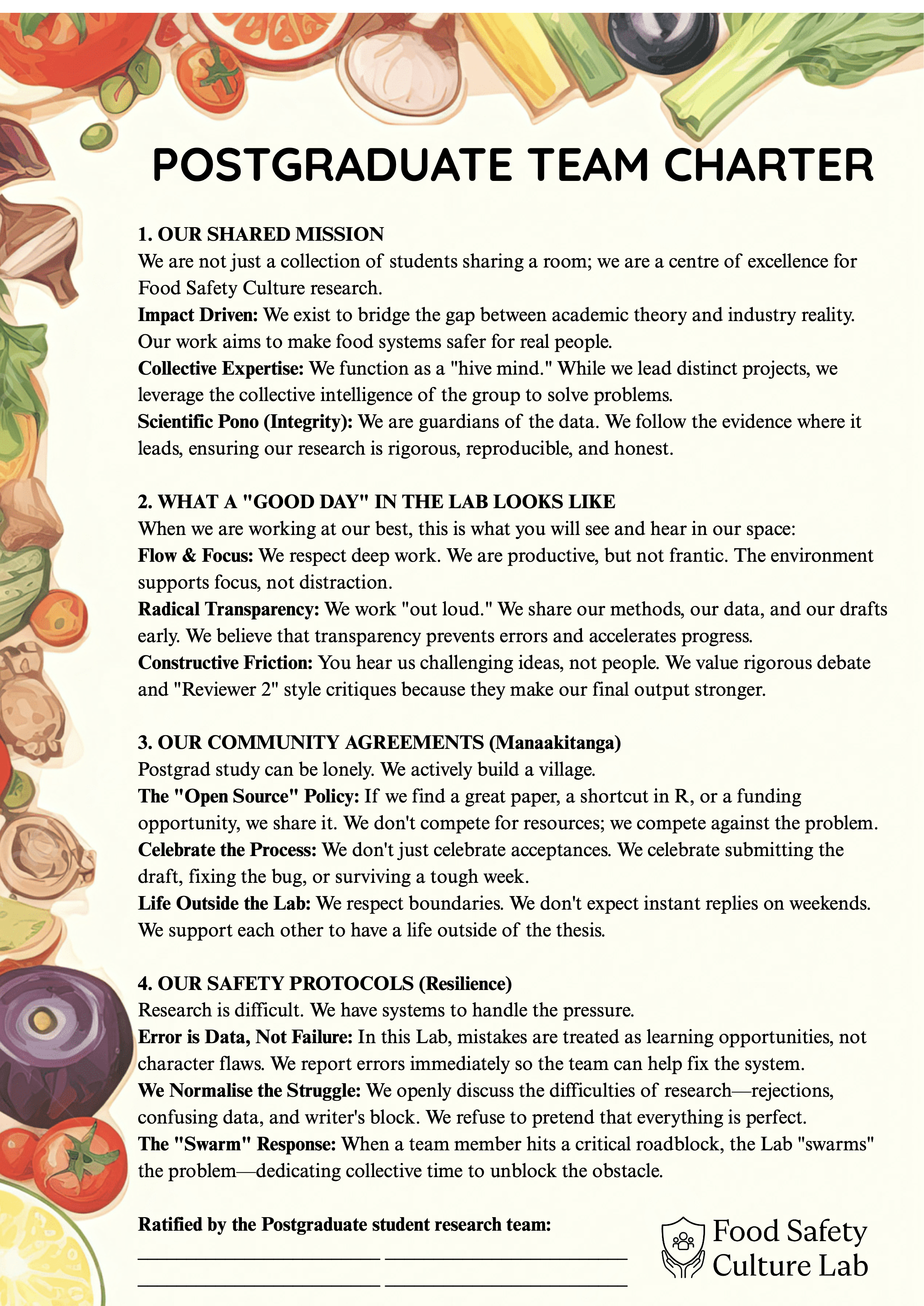 In this lab, we’re doing things differently. We’ve committed to a village mentality because we know postgraduate research is a marathon, not a sprint. Our charter ensures, among many other things: